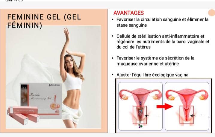 Gel Féminin est un produit exceptionnel à base de plantes, qui aide à garder votre vagin propre, à équilibrer votre niveau de pH et à promouvoir les bonnes bactéries pour combattre les infections. Ce produit merveilleux a d'autres avantages apaisants pour la santé tels que l'élimination des odeurs indésirables et l'hydratation du vagin, il aide également à restaurer l'élasticité du vagin. Ce produit est fortement recommandé pour les femmes souffrant de vaginite, cervicite, érosion cervicale, endométrite, démangeaisons de la vulve, vaginose bactérienne, fibromes utérins, infection urinaire, kystes ovariens et relations sexuelles douloureuses.